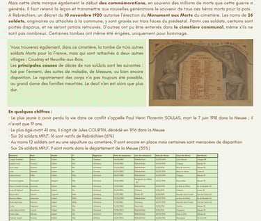 Ce travail de recherche révèle que les soldats sont nés entre 1874 et 1898. Ces hommes, ouvriers agricoles, cultivateurs ou artisans, ont fait en grande partie leur service militaire avant d’intégrer différents régiments lors de la guerre. Ils sont décédés tragiquement entre 1914 et 1918 durant les différentes batailles dont les plus connues et meurtrières, comme la bataille de la Somme, de la Champagne ou celle de Verdun. Certains d’entre eux ont été cités à l’ordre de leur régiment, c’est-à-dire une reconnaissance pour leur acte de bravoure. Certains ont aussi été décorés par à titre posthume (médaille, croix de guerre).