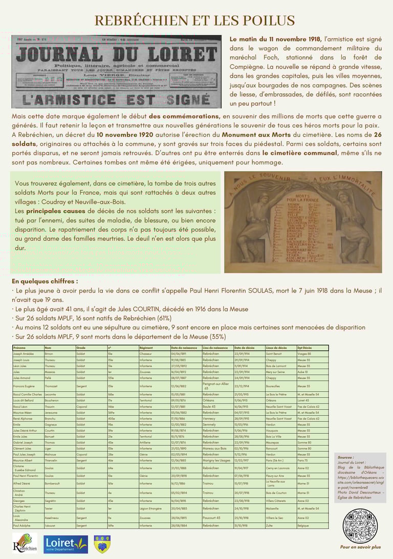 Ces recherches sont aussi riches d’informations sur les lieux de vie de ces soldats à Rebréchien, dans le bourg ou les fermes alentours, mais aussi sur la généalogie des familles présentes pour certaine au moins depuis le 17ᵉ s. dans le village. Certains d’entre eux étaient aussi père de famille.
