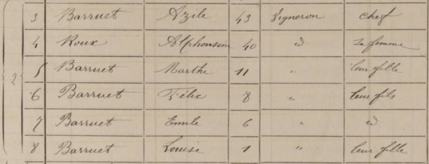 Lors du recensement de 1891, la famille vit toujours au Haut Thibert. On y apprend que la famille BARRUET vit à côté de la famille PELLE, et donc que Jules BARRUET (14 ans) est voisin du petit Jules PELLE (3 ans), qui connaitront tous les deux le même destin, sur le Front de la Guerre.