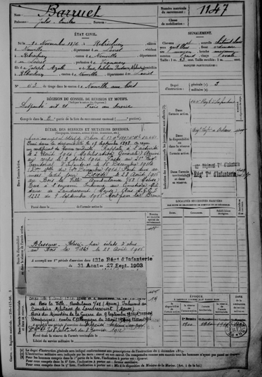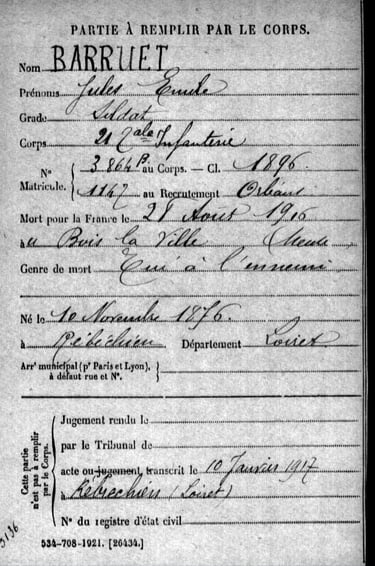 Au 2 août 1914, Jules Emile BARRUET est appelé à combattre pour sa patrie. Il est donc mobilisé et rejoint le 40ᵉ Régiment d’Infanterie Territoriale (RIT) à Orléans pendant 4 mois, avant de rejoindre le 21ᵉ RIT, et d'aller au front : La Somme (fin 1914), L’Artois (6 mois dans les tranchées), la Champagne (d'août 1915 à Juin 1916), puis Verdun à partir de Juillet 1916.