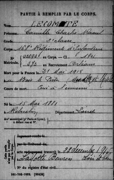 Affecté au 168ᵉ Régiment d’Infanterie à Toul, il passera le premiers mois de la guerre à défendre la forteresse de Toul avec son régiment. Puis le 168ᵉ RI combat toute la fin de l’année 1914, jusqu’à l’été 1915 dans les environs de Pont-à-Mousson. Camille LECOMTE y perd la vie le 22 décembre 1914, tué à l’ennemi à l'âge de 33 ans.