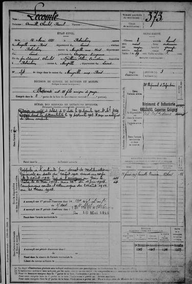Camille LECOMTE nait le dimanche 15 mai 1881 à Rebréchien, troisième enfant d’Edouard Charles LECOMTE, couvreur, et de Félicie Ernestine GRILLIERRE. Il est également le dernier enfant de ce couple, puisque le patriarche, Edouard, décède deux ans après la naissance de Camille, le samedi 2 juin 1883 à Rebréchien.