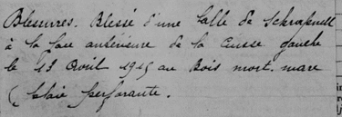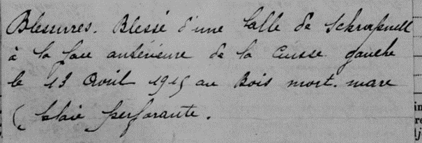 Le 13 avril 1915, Paul Adolphe est blessé dans le secteur du Bois-Mort-Mare, à une dizaine de kilomètres à l’ouest de Pont-à-Mousson. Sa fiche matricule mentionne une plaie perforante à la cuisse gauche, par une balle de Schrapnell. Nous ne connaissons pas la durée de son indisponibilité. Il a certainement été évacué vers une ambulance, un hôpital militaire en retrait du front, pendant quelques semaines.