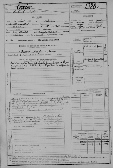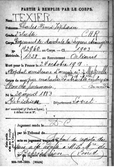 Charles Henri Zéphirin TEXIER nait le vendredi 20 Avril 1883, aux alentours de 20 heures, dans la maison familiale au Bourg de Rebréchien. Il est le fils de Jean Baptiste TEXIER, journalier à cette époque, âgé de 47 ans, et de Elisa Zéphirine BRANCHU, journalière également, et âgée de 43 ans. C'est le dernier enfant d'une famille qui compte alors 4 filles et 4 garçons, nés entre 1859 et 1883 :