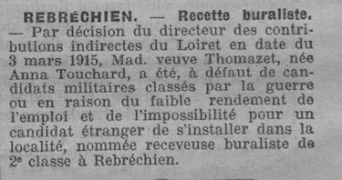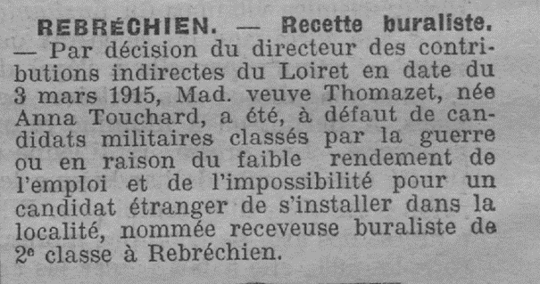Le Journal du Loiret du 12 mai 1915 nous apprend que c’est la veuve de François THOMAZET qui reprend sa licence de buraliste pour la commune de Rebréchien, à la suite du décès de son mari :