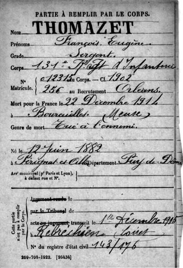 Lors de la mobilisation générale d’août 1914, il intègre le 131ᵉ Régiment d’Infanterie d’Orléans, au grade de sergent. Il combattra durant 4 mois au front, dans la région de l’Argonne, au nord de la Meuse, théâtre de combats des plus difficiles. Francisque THOMAZET décèdera le 22 décembre 1914, tué à l’ennemi à Boureuilles. Il avait alors 32 ans.